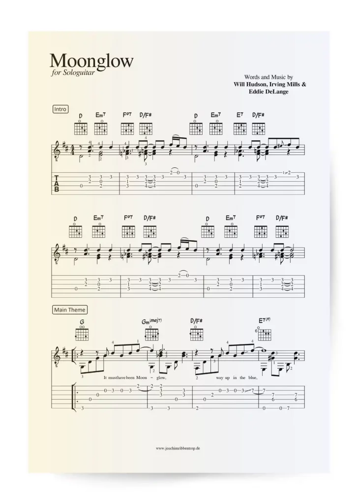 - Intermediate Level arrangement of the jazz standard "Moonglow" for solo guitar