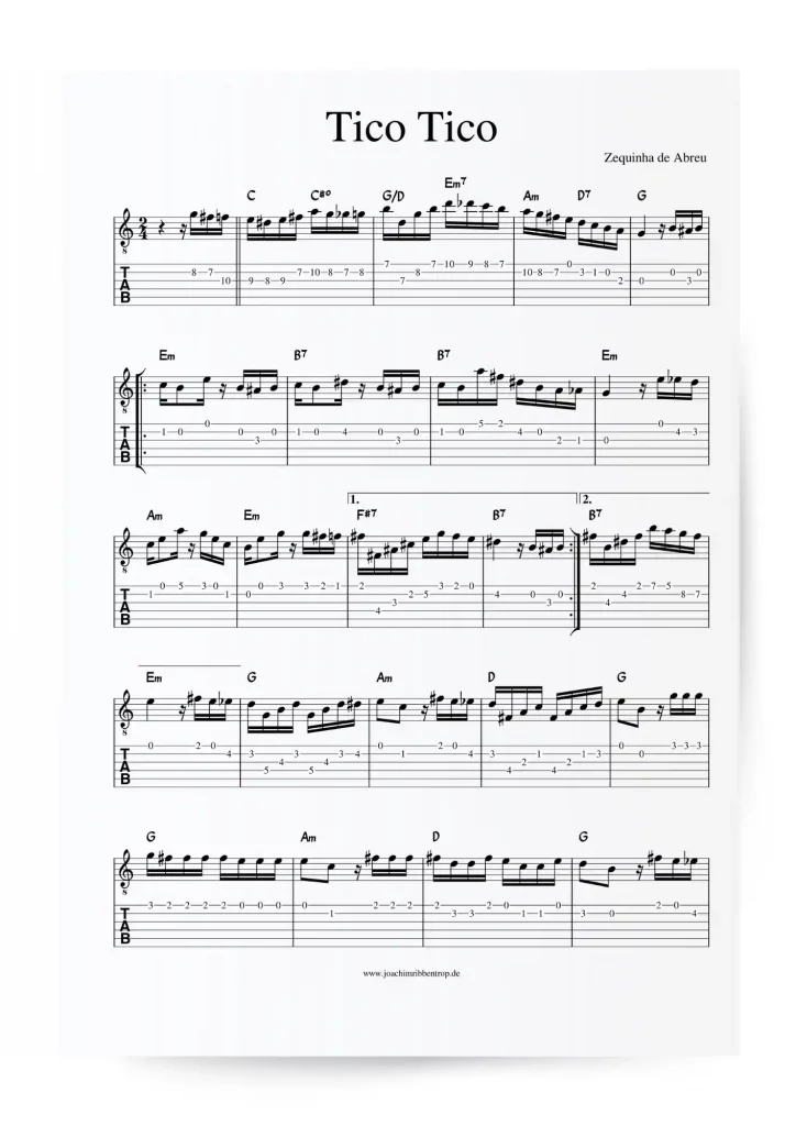 This is the lead sheet to the famous Choro by Zequinha de Abreu, inspired by the phenomenal performance of Paco de Lucia. Paco's performance is nothing short of awe-inspiring, and I have arranged a simplified version for you. You are going to learn the melody to 'Tico Tico' along with his recording!